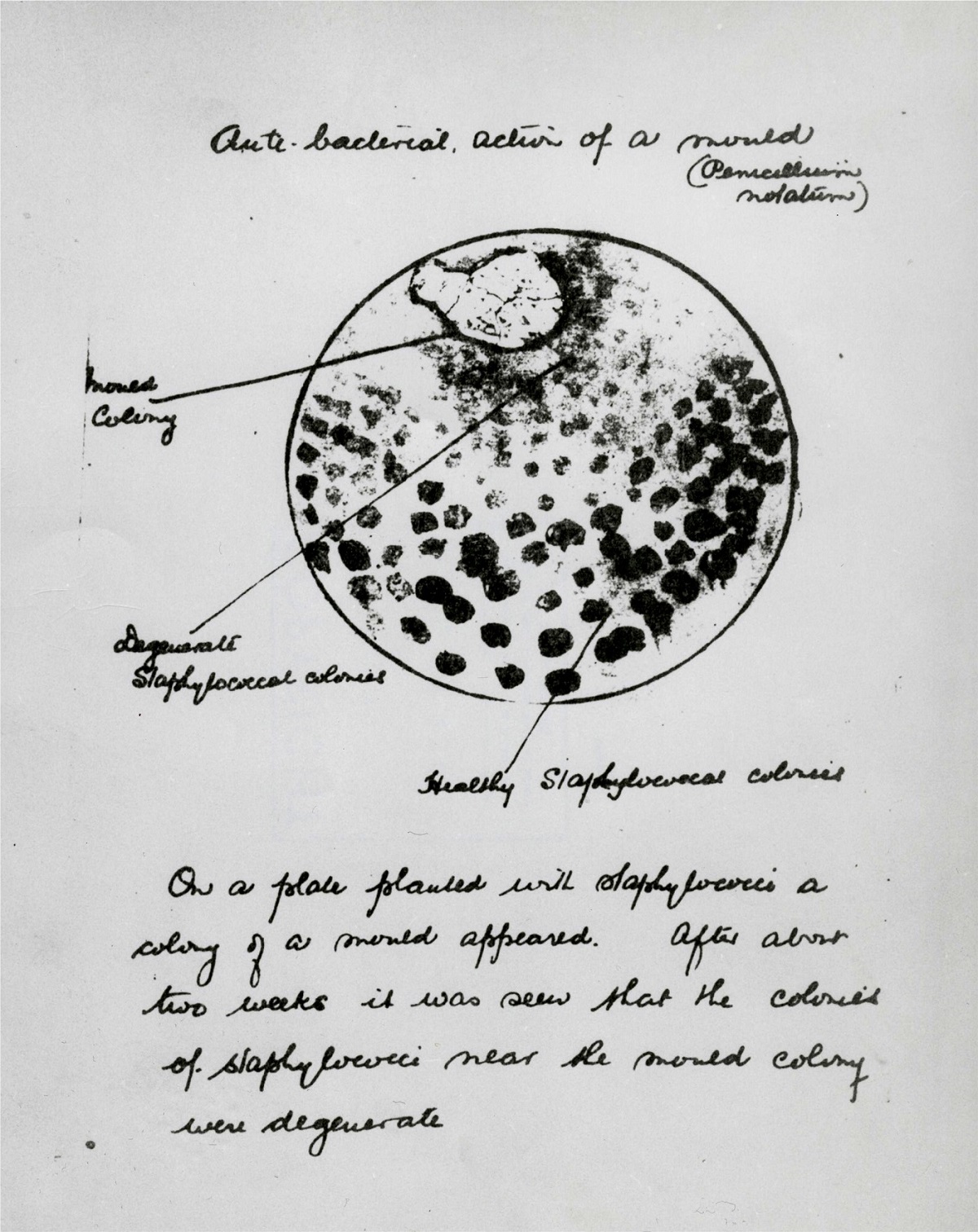 Het originele kweekschaaltje met de penseelschimmel, nagetekend en voorzien van aantekeningen door Alexander Fleming. Bovenaan schreef hij: ‘Antibacteriële werking van een schimmel (Penicillium notatum)’. Foto: Alexander Fleming Laboratory Museum, Imperial College Healthcare NHS Trust. Fotograaf: (onbekend). © Alexander Fleming Laboratory Museum, Imperial College Healthcare NHS Trust.