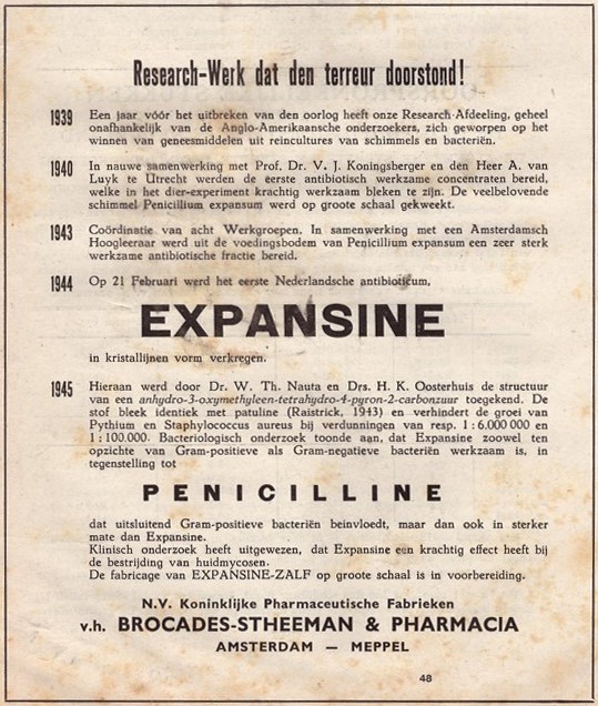 Aankondiging van de grootschalige productie van expansinezalf door de N.V. Koninklijke Pharmaceutische Fabrieken v/h Brocades-Stheeman & Pharmacia (nu DSM), 1945. Nederlandsch tijdschrift voor geneeskunde, noodnummer 27 (1945), voorpagina. Om verschillende redenen kon het bedrijf het product echter nooit op de markt brengen.