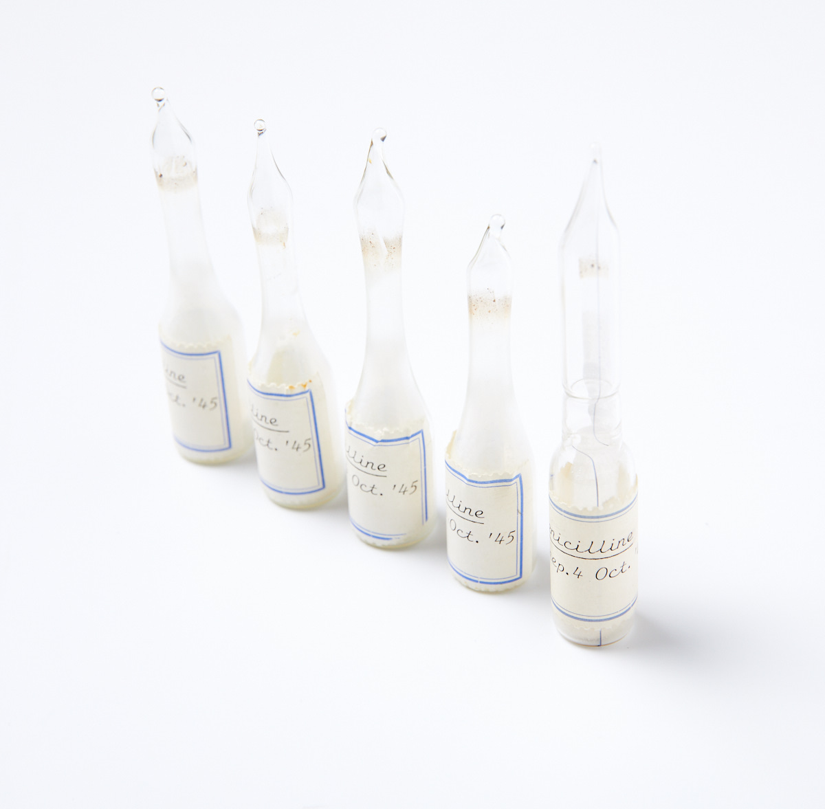 Ampullen uit de voormalige Nederlandsche Gist- en Spiritusfabriek met als opschrift: ‘Penicilline. Prep. 4 Oct. ‘45’. Delft, Collectie bedrijfserfgoed DSM. Foto: Stichting Farmaceutisch Erfgoed. Fotograaf: Studio-Oost. © DSM, Delft. Het glas voor de ampullen werd op het fabrieksterrein zelf geblazen. Nadat het onderste deel van de ampul was gevuld, werd het glas aan de bovenkant verwarmd en met de hand afgeknipt. Daardoor hebben de buisjes van de ampullen verschillende afmetingen.