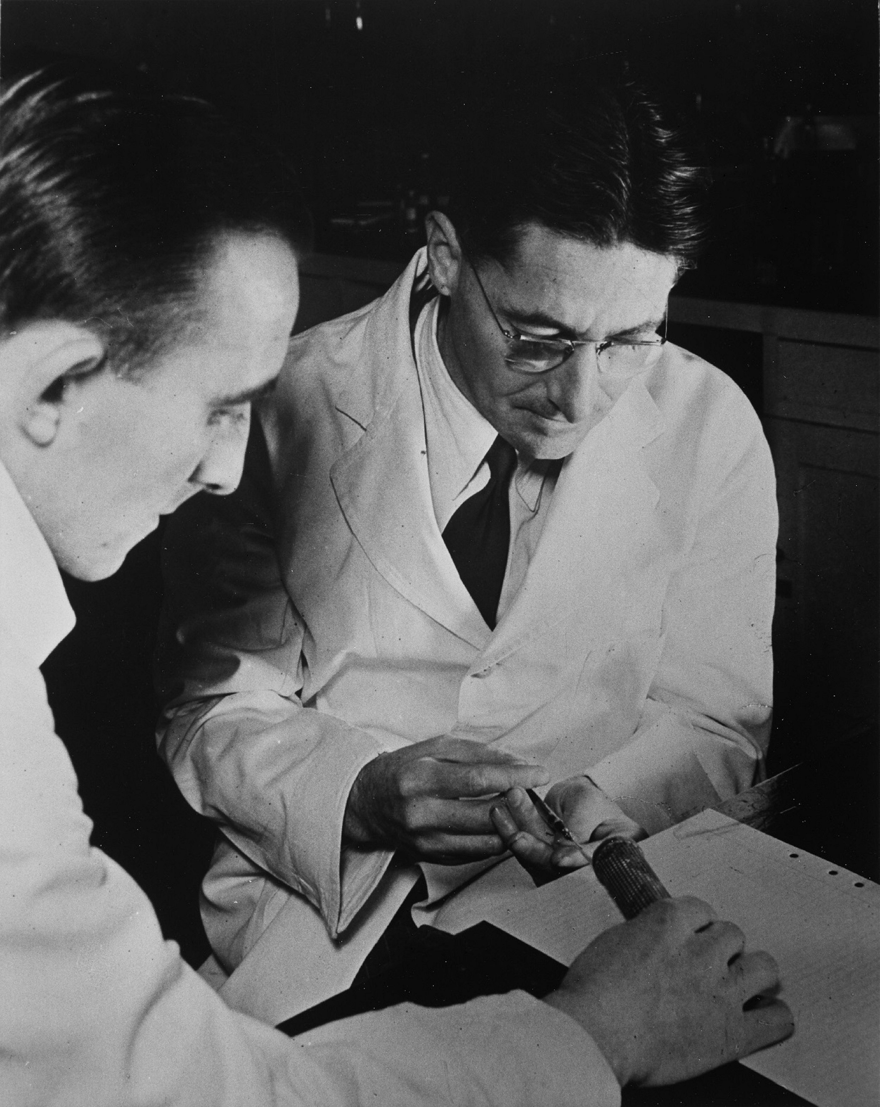 Geassisteerd door James H.D. Kent injecteert Howard Florey een muis met penicilline, mei 1940. Foto: Bodleian Libraries. Fotograaf: (onbekend). © Bodleian Libraries.