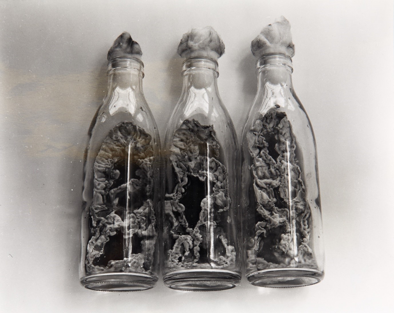 In de beginjaren werden de schimmels voor de productie van Bacinol gekweekt in melkflessen. Ondanks de schaarste tijdens de Tweede Wereldoorlog waren melkflessen nog voldoende voorhanden. Bovendien waren ze relatief eenvoudig te reinigen en te steriliseren. De schimmelculturen in deze flessen uit de jaren ’40 zijn door de jaren heen ingedroogd. Reproductie van een foto uit de collectie bedrijfserfgoed van DSM in Delft. © DSM, Delft.