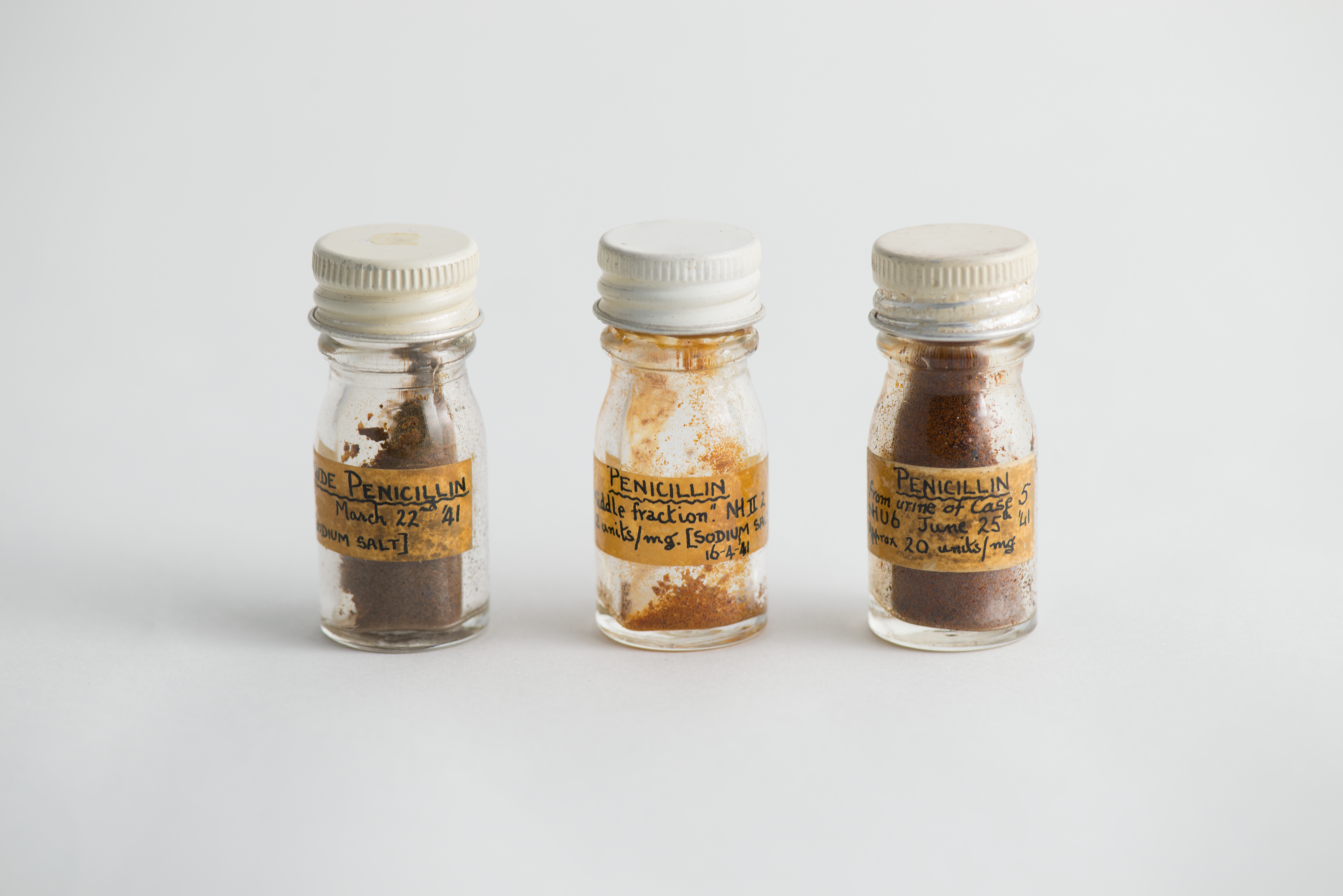 Penicilline in poedervorm, verkregen aan de Sir William Dunn School of Pathology in maart, april en juni 1941.  Oxford, Museum of the History of Science, inv.nrs. 16920, 26401 en 14439 (v.l.n.r.). Foto: Museum of the History of Science, University of Oxford. Fotograaf: (onbekend). © Museum of the History of Science, University of Oxford.