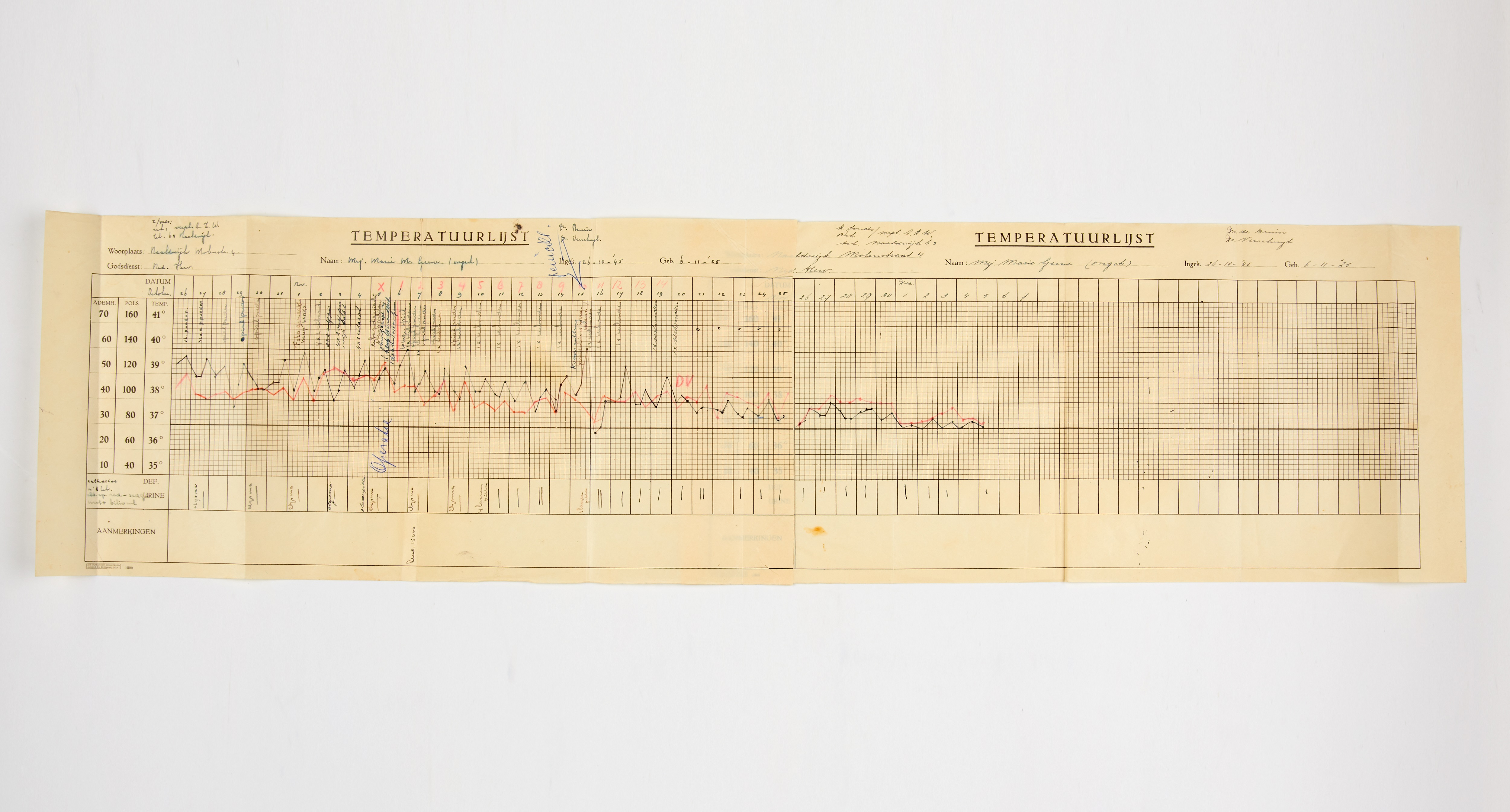 Temperatuurlijst van Marie Geene, de eerste patiënt die met Nederlandse penicilline werd behandeld. De jonge vrouw kreeg tien dagen na haar operatie voor het eerst intraveneus penicilline toegediend. Haar koorts begon daarna langzaam maar zeker te zakken. Delft, Medisch-Farmaceutisch Museum ‘De griffioen’. Foto: Stichting Farmaceutisch Erfgoed. Fotograaf: Studio-Oost. CC BY-NC-SA 3.0.