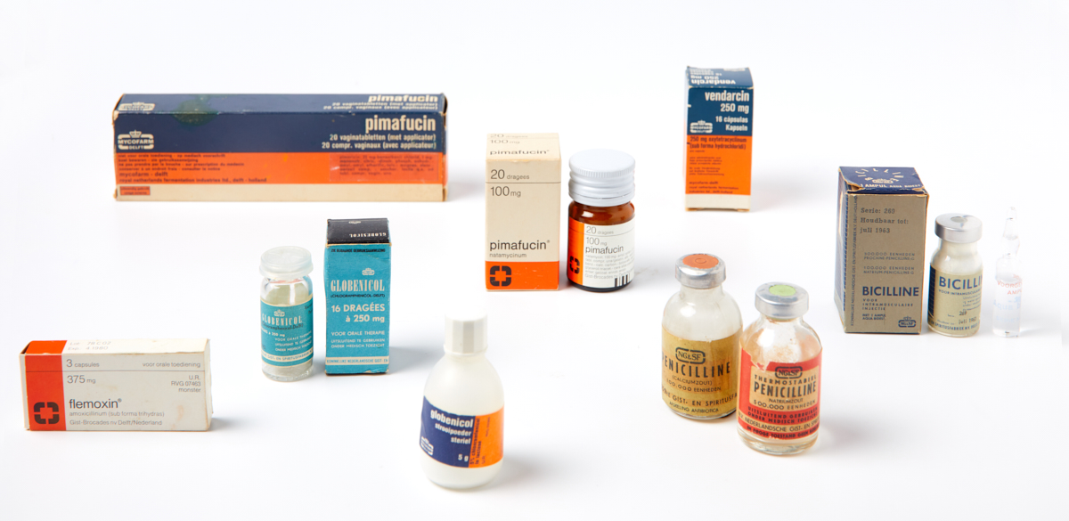 Verschillende typen antibiotica in verschillende toedieningsvormen, geproduceerd door NG&SF en haar rechtsopvolgers in de periode 1949-1985. Achter, v.l.n.r.: