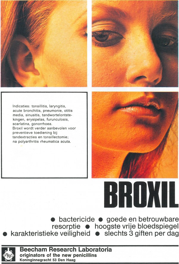 Rechts: Advertentie voor Broxil®, 1969. Dit antibioticum werd in 1961 in Nederland op de markt gebracht door Beecham Research Laboratories (nu GSK). Broxil® is nog steeds verkrijgbaar. Repertorium verpakte geneesmiddelen. Periodiek overzicht voor artsen (Haarlem: De Toorts, 1969), t.o. p. 208.