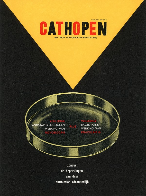 Links: Advertentie voor Cathopen®, 1957. Dit antibioticum werd in 1957 in Nederland op de markt gebracht door Merck Sharp & Dohme (MSD). Cathopen® is sinds vóór 1967 niet meer verkrijgbaar. Reproductie overgenomen uit: T. Pieters (red.), Geneesmiddel in beeld. Een eeuw farmaceutische productkennis in de etalage (Den Haag: KNMP Medicijn Media, 2018), p. 101.