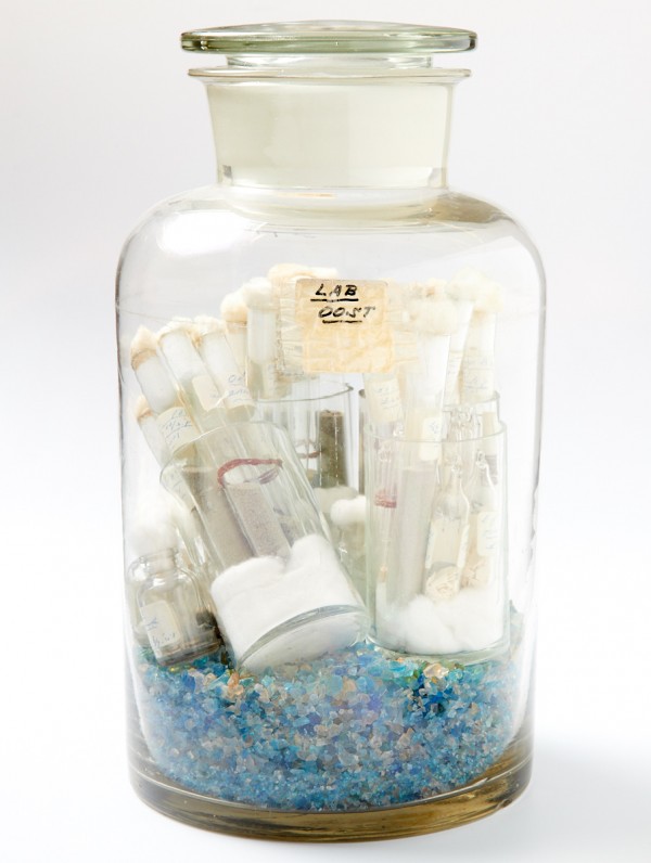 Rechts: Grote glazen stopfles, gebruikt om schimmelstammen te conserveren, jaren ’70. De Nederlandsche Gist- en Spiritusfabriek had in ‘Lab Oost’ en ‘Lab II’ in deze periode koelkamers met tientallen van dit soort flessen. Elk buisje bevatte sporen van een andere Penicillium-stam, ten behoeve van productieverbetering. Onderin de fles werd kopersulfaat gelegd, dat als vochtvreter diende. Delft, Collectie bedrijfserfgoed DSM. Foto: Stichting Farmaceutisch Erfgoed. Fotograaf: Studio-Oost. © DSM, Delft.