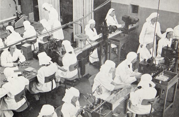 Links: De verpakkingsafdeling voor penicilline en depocilline van de Nederlandsche Gist- en Spiritusfabriek in Delft, ca. 1948. Foto overgenomen uit: N.V. Nederlandsche Gist- en Spiritusfabriek Delft. Verslag over het 80ste boekjaar 1949 (Delft: N.V. Nederlandsche Gist- en Spiritusfabriek, 1949), zonder paginering.