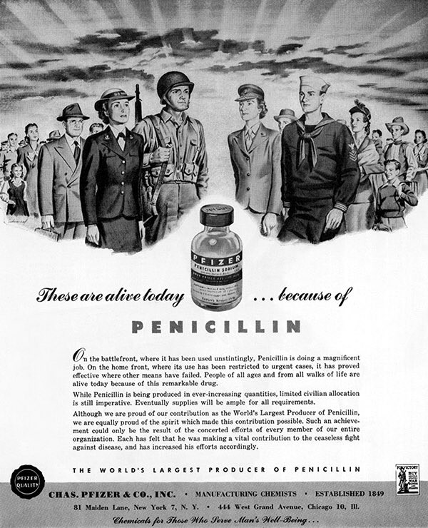 Rechts: Reclameposter van Chas. Pfizer & Co., Inc. (nu Pfizer), een Amerikaanse fabrikant van penicilline, ca. 1944. De tekst leest onder meer: “On the battlefront, […] Penicillin is doing a magnificent job.” Reproductie: Pfizer Photo Archives. Met dank aan Pfizer Inc.