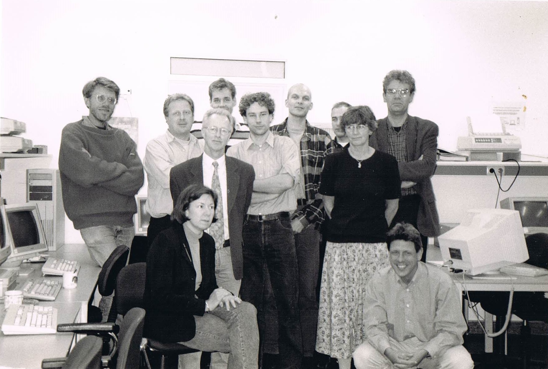 Medewerkers van het datalab van het departement Farmacie van de Rijksuniversiteit Utrecht, begin jaren negentig. Te zien zijn onder meer Lyda Blom, Olaf Klungel, Ton de Boer en Bert Leufkens, Het team staat bij een aantal apotheeksystemen uit die tijd, waarmee werd geoefend voor onderwijs en onderzoek. Op het gebied van onderzoek legde Ron Herings (tweede van links) hier de basis voor PHARMO, later een van de toonaangevende dataplatforms in de wereld voor farmacoepidemiologisch onderzoek. Foto: privébezit. Fotograaf: (onbekend).