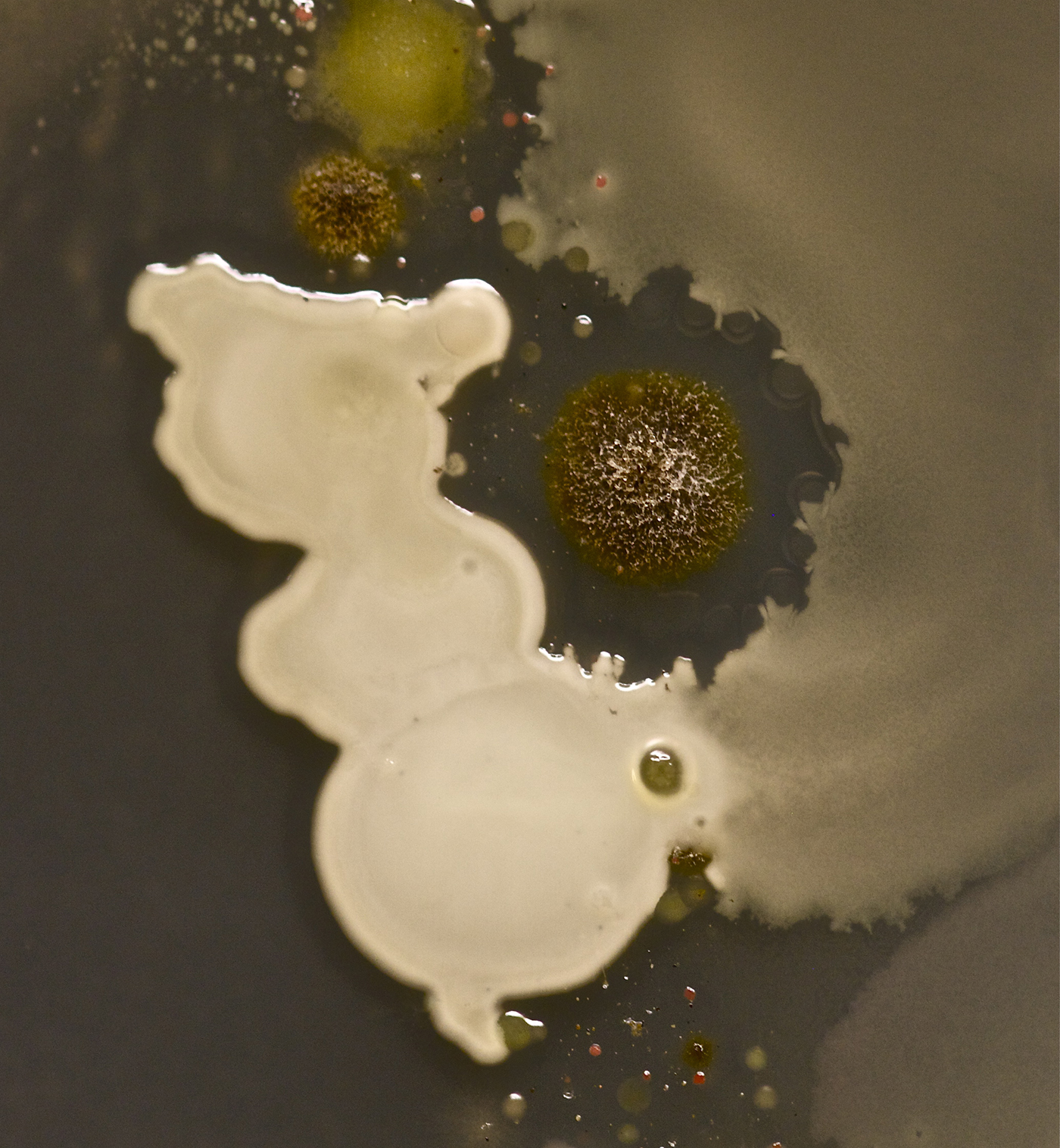 Een niet-geïdentificeerde schimmel, omgeven door twee verschillende bacteriën. Rondom de schimmel is de zogenaamde remmingszone duidelijk zichtbaar. In deze halo wordt de groei van de bacteriën geremd door de aanwezigheid van de schimmel. Foto: Tasha Sturm, Cabrillo College. Fotograaf: Tasha Sturm. © Tasha Sturm, Cabrillo College.