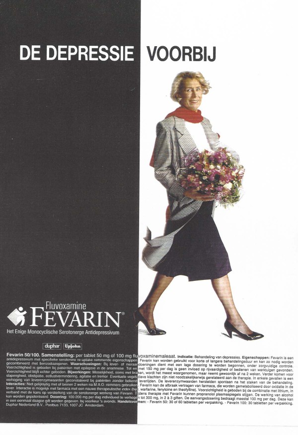 Opvallend in deze reclames voor psychiatrische geneesmiddelen (psychofarmaca) is dat vrouwen consequent tweemaal zo vaak worden afgebeeld als mannen. Dit lijkt verband te houden met de kennis dat kalmeringsmiddelen en antidepressiva gemiddeld tweemaal zoveel voorgeschreven worden aan vrouwen. En sluit aan op de waarneming dat huisartsen en psychiaters twee- tot driemaal zo vaak de diagnose depressie stellen bij vrouwen dan bij mannen.