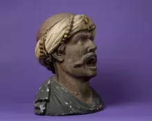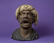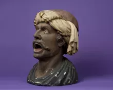 Deze moor draagt een blauwe mantel en een rood-witte tulband. De tulband is versierd met goudkleurige gebedssnoeren en een goudkleurige, ruitvormige sierspeld. In de hals is goed te zien dat de gaper is samengesteld uit verschillende delen, die aan elkaar zijn genageld. Om het hout te beschermen tegen regen is bovenop de tulband een loden afdekplaat bevestigd.