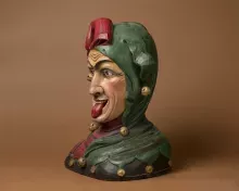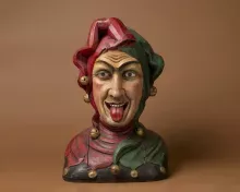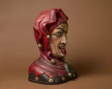 Deze nar draagt een donkergrijs onderkleed en een groen-rode zotskap. Aan de muts zijn goudkleurige versiersels en narrenbelletjes bevestigd. Het is goed te zien dat de gaper is samengesteld uit losse delen. De delen werden eerst aan elkaar genageld, pas daarna werd het beeld gesneden.