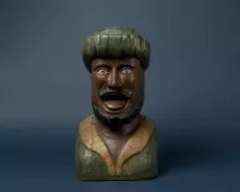 Deze moor draagt een groene mantel met een brede, gele, omgeslagen kraag, een bruin onderhemd en een groene tulband. Op de revers van de mantel is een gestileerd patroon aangebracht.