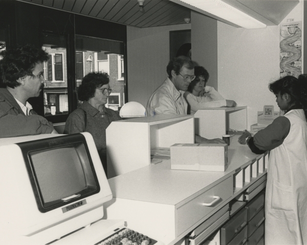 Twee apothekersassistenten in de Singel Apotheek in Deventer, begin jaren tachtig. Foto: privébezit. Fotograaf: J. Winters.