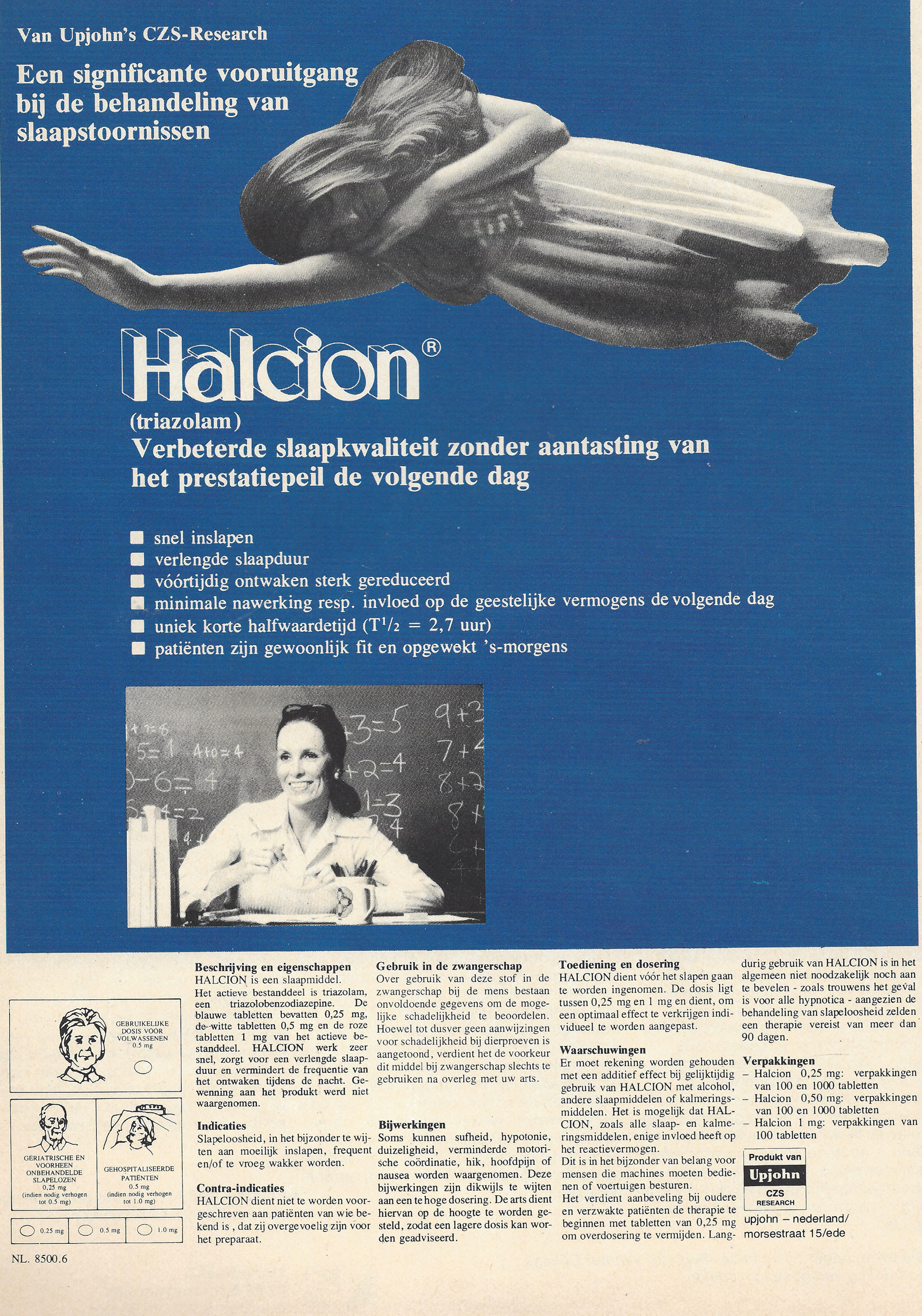 Het gaat hier om een reclame voor het controversiële slaapmiddel Halcion begin 1980 in het zwaar gesponsorde artsentijdschrift Modern Medicine. De producent van het middel is het Amerikaanse farmaceutische bedrijf Upjohn. In de zomer van 1979, zes weken nadat de cliëntenbeweging in de psychiatrie de ‘Valium-vrije vrijdag’ had uitgeroepen, raakt Halcion (triazolam) in opspraak. De klokkenluider psychiater Van der Kroef in het TV-programma ‘Televizier Magazine’ laat weten dat triazolam ernstige bijwerkingen (o.a. agressie, geheugenverlies en suïcidaliteit) heeft. De druk van de publieke opinie is zo groot dat het College ter Beoordeling van Geneesmiddelen zich gedwongen voelt om in te grijpen. Begin 1980 wordt de registratie van Halcion geschrapt. Buitenlandse artsen vinden de Nederlandse reactie ongeloofwaardig en spreken van ‘Dutch hysteria’. Pas in de jaren negentig zal ook in het buitenland het Halcion-syndroom erkend worden en het slaapmiddel in de ban gedaan worden.